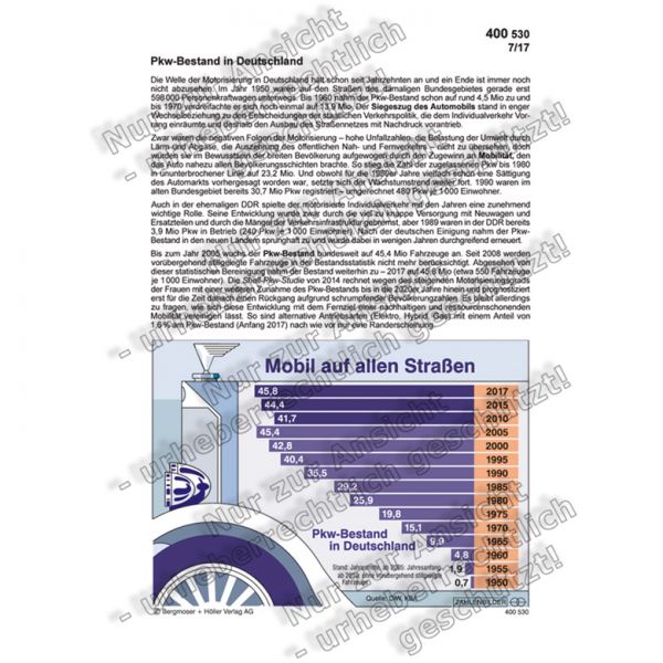Die Welle der Motorisierung in Deutschland hält schon seit Jahrzehnten an und ein Ende ist noch immer nicht abzusehen. Im Jahr 1950 waren auf den Straßen des damaligen Bundesgebiets gerade erst 598000 Personenkraftwagen unterwegs. Bis 1960 nahm der westdeutsche Pkw-Bestand schon auf rund 4,5 Mio zu und bis 1970 verdreifachte er sich noch auf 13,9 Mio. Der Siegeszug des Automobils stand in enger Wechselbeziehung zu den Entscheidungen der staatlichen Verkehrspolitik, die dem Individualverkehr Vorrang einräumte und deshalb den Ausbau des Straßennetzes mit Nachdruck vorantrieb.