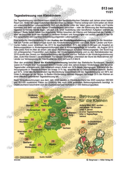 Die Tagesbetreuung von Kleinkindern nimmt in den familienpolitischen Debatten seit Jahren einen breiten Raum ein. Hinter den gegensätzlichen Standpunkten zu diesem Thema verbirgt sich nicht selten ein Streit um unterschiedliche Lebensentwürfe: Soll sich die Mutter (oder der Vater) ganz um Kinder und Familie kümmern und dafür auf eine eigene Erwerbstätigkeit verzichten – oder die Betreuung des Nachwuchses tagsüber in fremde Hände legen, um sich z.B. einer Ausbildung oder beruflichen Aufgaben widmen zu können? Beide Seiten führen gute Argumente an: Kinder brauchen die Wärme und Geborgenheit der Familie, aber sie brauchen auch den Kontakt zu anderen Kindern und Anregungen von außen, gerade in den für ihre sprachliche und kognitive Entwicklung prägenden Lebensjahren.