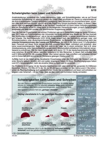 Über die Zahl der Erwachsenen mit solchen Problemen gab es in Deutschland lange nur grobe Schätzungen. 2011 legte ein Forschungsteam der Universität Hamburg erstmals eine Studie vor, die das Ausmaß des „funktionalen Analphabetismus“, wie er damals bezeichnet wurde, in seinen verschiedenen Abstufungen erfasste. Die Nachfolgestudie (LEO 2018) fragte erneut nach der Verbreitung geringer Lese- und Schreibkompetenz unter deutschsprechenden Erwachsenen. Im Blickpunkt der Untersuchung steht das unterste Kompetenzniveau des Lesens und Schreibens, das sich in die Alpha-Level 1-3 untergliedern lässt. Personen auf dieser Stufe können allenfalls einzelne Sätze lesen, schreiben und verstehen, aber keine zusammenhängenden Texte. Sie sind nicht in der Lage, die in einem einfachen Text (z.B. einer Arbeitsanweisung, einer Gebrauchsanleitung oder einem Beipackzettel) enthaltenen Informationen sinnerfassend zu entnehmen. Wie die neue Studie ergab, sind davon 12,1 % der deutschsprechenden Bevölkerung zwischen 18 und 64 Jahren betroffen, insgesamt 6,2 Mio Menschen. In dieser Zahl enthalten sind rund 2 Millionen (4,0 %), die einzelne Wörter, aber keinen ganzen Satz entziffern und schreiben können und im Extremfall nicht einmal bis zur Wortebene gelangen (Alpha-Level 1-2).