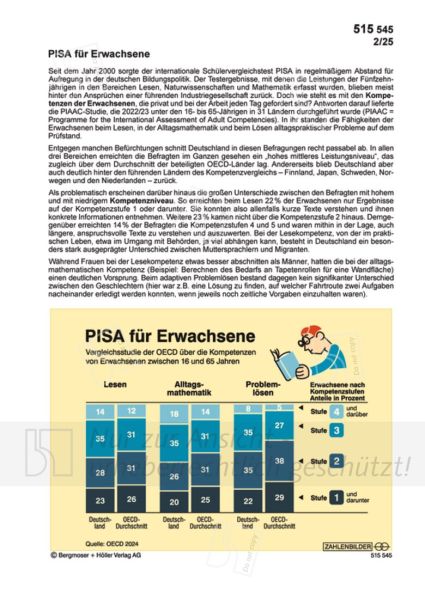 Seit dem Jahr 2000 sorgte der internationale Schülervergleichstest PISA in regelmäßigem Abstand für Aufregung in der deutschen Bildungspolitik. Der Testergebnisse, mit denen die Leistungen der Fünfzehnjährigen in den Bereichen Lesen, Naturwissenschaften und Mathematik erfasst wurden, blieben meist hinter den Ansprüchen einer führenden Industriegesellschaft zurück. Doch wie steht es mit den Kompetenzen der Erwachsenen, die privat und bei der Arbeit jeden Tag gefordert sind? Antworten darauf lieferte die PIAAC-Studie, die 2022/23 unter den 16- bis 65-Jährigen in 31 Ländern durchgeführt wurde (PIAAC = Programme for the International Assessment of Adult Competencies). In ihr standen die Fähigkeiten der Erwachsenen beim Lesen, in der Alltagsmathematik und beim Lösen alltagspraktischer Probleme auf dem Prüfstand.