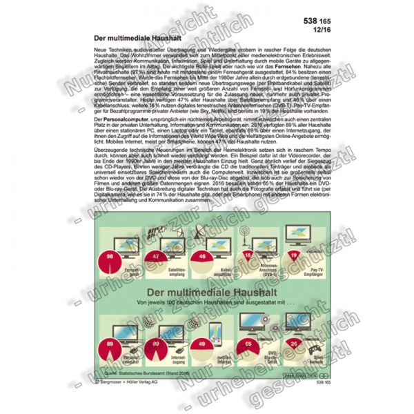 Neue Techniken audiovisueller Übertragung und Wiedergabe haben in rascher Folge die deutschen Haushalte erobert. Das Wohnzimmer ist heute Mittelpunkt einer medienelektronischen Erlebniswelt. Zugleich werden Kommunikation, Information, Spiel und Unterhaltung durch mobile Geräte zu allgegenwärtigen Begleitern im Alltag. Die wichtigste Rolle spielt aber nach wie vor das Fernsehen. Nahezu alle Privathaushalte (96 %) sind heute mit mindestens einem Fernsehgerät ausgestattet; 91 % besitzen einen Flachbildfernseher. Wurde das Fernsehen bis Mitte der 1980er Jahre allein durch erdgebundene (terrestrische) Sender verbreitet, so standen seitdem neue Übertragungswege (per Breitbandkabel und Satellit) zur Verfügung, die den Empfang einer weit größeren Anzahl von Fernseh- und Hörfunkprogrammen ermöglichten – eine wesentliche Voraussetzung für die Zulassung neuer, nunmehr auch privater Programmveranstalter. Heute haben 45 % aller Haushalte Satellitenempfang, 43 % einen Kabelanschluss, 19 % können über eine DSL/Internet-Verbindung fernsehen und weitere 10 % nutzen digitales terrestrisches Antennenfernsehen (DVB-T2). Pay-TV-Empfänger für Bezahlprogramme privater Anbieter (wie Sky, Netflix) sind in 20 % der Haushalte vorhanden.