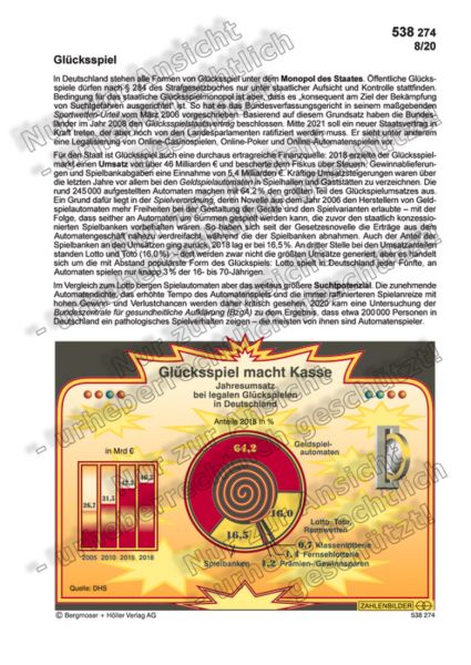 Für den Staat ist Glücksspiel auch eine durchaus ertragreiche Finanzquelle: 2018 erzielte der Glücksspielmarkt einen Umsatz von über 46 Milliarden € und bescherte dem Fiskus über Steuern, Gewinnablieferungen und Spielbankabgaben eine Einnahme von 5,4 Milliarden €. Kräftige Umsatzsteigerungen waren über die letzten Jahre vor allem bei den Geldspielautomaten in Spielhallen und Gaststätten zu verzeichnen.