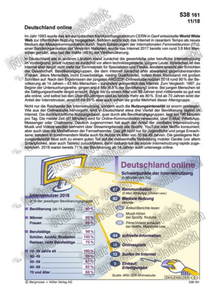 In Deutschland wie in anderen Ländern stand zunächst die gewerbliche oder berufliche Internetnutzung im Vordergrund, privat nutzten es zunächst vor allem technikbegeisterte, jüngere Leute. Inzwischen ist das Internet aber längst nicht mehr nur Tummelplatz für Spezialisten und Freaks, sondern erreicht alle Schichten der Gesellschaft. Bevölkerungsgruppen, die dem Internet zunächst eher abwartend gegenüberstanden (Frauen, ältere Menschen, nicht Erwerbstätige, niedrig Qualifizierte), holten ihren Rückstand mit großen Schritten auf. Nach den Ergebnissen der jüngsten ARD/ZDF-Onlinestudie nutzten 2018 rund 90 % der Bevölkerung ab 14 Jahren – 63 Mio Menschen – zumindest gelegentlich das Internet. Zum Vergleich: 1997, zu Beginn der Untersuchungsreihe, gingen erst 4 Mio (6,5 % der Bevölkerung) online. Bei jungen Menschen ist die Sättigungsschwelle längst erreicht. Sogar bis zu einem Alter von 59 Jahren sind mittlerweile so gut wie alle online, und selbst bei den Über-60-Jährigen sind es bereits mehr als 80 %. Erst ab 70 Jahren sinkt der Anteil der Internetnutzer, erreicht mit 65 % aber auch schon die große Mehrheit dieser Altersgruppe.