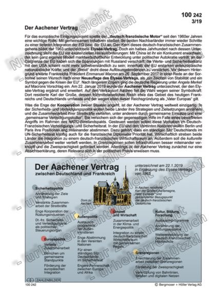 Für das europäische Einigungsprojekt spielte der „deutsch-französische Motor“ seit den 1960er Jahren eine wichtige Rolle. Mit gemeinsamen Initiativen stießen die beiden Nachbarländer immer wieder Schritte zu einer tieferen Integration der EG bzw. der EU an. Den Kern dieses deutsch-französischen Zusammengehens bildet der 1963 unterzeichnete Élysée-Vertrag. Doch ein halbes Jahrhundert nach dessen Unterzeichnung steht die EU vor existenziellen Herausforderungen: Mit China ist ihr ein Konkurrent erwachsen, der sein ganz eigenes Modell marktwirtschaftlicher Entwicklung unter politischer Autokratie vertritt; an der Ostgrenze der EU haben sich die Spannungen mit Russland verschärft; die Werte- und Sicherheitsallianz mit den USA scheint nicht mehr selbstverständlich zu sein; innerhalb der EU erstarken antieuropäische nationalistische Kräfte; und der „Brexit“ droht diese Auflösungstendenzen zu verstärken. Vor diesem Hintergrund erklärte Frankreichs Präsident Emmanuel Macron am 26. September 2017 in einer Rede an der Sorbonne seinen Wunsch nach einer Neuauflage des Élysée-Vertrags, als „ein Zeichen von Stabilität und ein Symbol gegen die Krisen der EU“. Nach längerem Zögern ging die deutsche Regierung unter Angela Merkel auf Macrons Vorschlag ein. Am 22. Januar 2019 wurde der Aachener Vertrag unterzeichnet, der den Elysée-Vertrag ergänzt und erweitert. Auf den Vertragsort Aachen fiel die Wahl wegen seiner Symbolkraft: Dort residierte Karl der Große, dessen frühmittelalterliches Reich etwa das Gebiet des heutigen Frankreichs und Deutschlands umfasste und der wegen eben dieser Reichsgründung als „Vater Europas“ gilt.