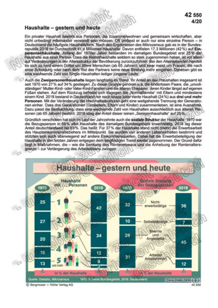 Ein privater Haushalt besteht aus Personen, die zusammenwohnen und gemeinsam wirtschaften, aber nicht unbedingt miteinander verwandt sein müssen. Oft umfasst er auch nur eine einzelne Person – in Deutschland die häufigste Haushaltsform. Nach ersten Ergebnissen des Mikrozensus gab es in der Bundesrepublik im ersten Halbjahr 2023 rund 41,1 Millionen Haushalte. Davon entfielen 16,7 Millionen (41 %) auf Einpersonenhaushalte. Anfang der 1970er Jahre bestanden im damaligen Bundesgebiet erst 25 % der Haushalte aus einer Person. Dass die Kleinsthaushalte seitdem so stark zugenommen haben, ist vor allem auf Veränderungen im Altersaufbau der Bevölkerung zurückzuführen. Bei den Alleinlebenden handelt es sich zu mehr als einem Drittel (36 %) um ältere Menschen ab 65 Jahren, und zwar meist um Frauen, die nach einer Scheidung oder nach dem Tod des Partners keine neue Bindung mehr eingehen. Daneben gibt es eine wachsende Zahl von Single-Haushalten lediger jüngerer Leute.