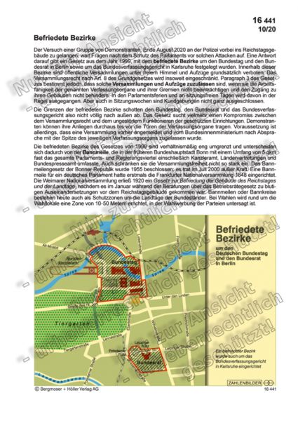 Der Versuch einer Gruppe von Demonstranten, Ende August 2020 an der Polizei vorbei ins Reichstagsgebäude zu gelangen, warf Fragen nach dem Schutz des Parlaments vor solchen Attacken auf. Eine Antwort darauf gibt ein Gesetz aus dem Jahr 1999, mit dem befriedete Bezirke um den Bundestag und den Bundesrat in Berlin sowie um das Bundesverfassungsgericht in Karlsruhe festgelegt wurden. Innerhalb dieser Bezirke sind öffentliche Versammlungen unter freiem Himmel und Aufzüge grundsätzlich verboten. Das Versammlungsrecht nach Art. 8 des Grundgesetzes wird insoweit eingeschränkt. Paragraph 3 des Gesetzes bestimmt jedoch, dass solche Versammlungen und Aufzüge zuzulassen sind, wenn sie die Arbeitsfähigkeit der genannten Verfassungsorgane und ihrer Gremien nicht beeinträchtigen und den Zugang zu ihren Gebäuden nicht behindern. In den Parlamentsferien und an sitzungsfreien Tagen wird davon in der Regel ausgegangen. Aber auch in Sitzungswochen sind Kundgebungen nicht ganz ausgeschlossen.