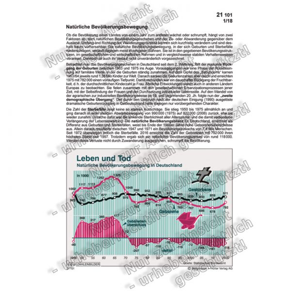 Die Zahl der Sterbefälle zeigt keine so starken Ausschläge. Sie stieg 1950 bis 1975 allmählich an und ging danach in einer stetigen Abwärtsbewegung von 990 000 (1975) auf 822 000 (2006) zurück, ehe sie wieder zunahm. Ursache dafür war die sinkende Sterblichkeit aller Altersstufen und die damit verbundene Verlängerung der Lebenserwartung. Die natürliche Bevölkerungsbilanz für Deutschland, errechnet als Differenz aus Geburten und Sterbefällen, weist bis Ende der 1960er Jahre hohe Geborenenüberschüsse aus. Allein daraus resultierte zwischen 1947 und 1971 ein Bevölkerungszuwachs von 7,4 Mio Menschen. Seit 1972 überwiegen jedoch die Sterbefälle. 2020 wurden deutschlandweit 773 000 Kinder geboren. Im gleichen Jahr starben nahezu 986 000 Menschen. Daraus resultierte ein natürlicher Bevölkerungsverlust von rund 212 000 – höher denn je in der Geschichte der Bundesrepublik. Werden solche Verluste nicht durch Zuwanderung ausgeglichen, schrumpft die Bevölkerung.