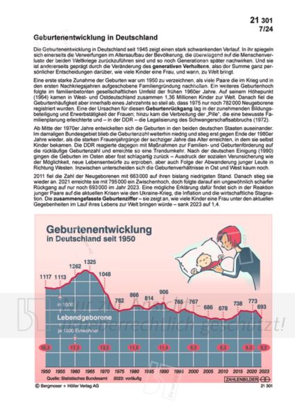 2011 fiel die Zahl der Neugeborenen mit 663 000 auf ihren bislang niedrigsten Stand. Danach stieg sie wieder an. 2021 erreichte sie mit 795 000 ein Zwischenhoch, doch folgte darauf ein ungewöhnlich scharfer Rückgang auf nur noch 693 000 im Jahr 2023. Eine mögliche Erklärung dafür findet sich in der Reaktion junger Paare auf die aktuellen Krisen wie den Ukraine-Krieg, die Inflation und die wirtschaftliche Stagnation. Die zusammengefasste Geburtenziffer – sie zeigt an, wie viele Kinder eine Frau unter den aktuellen Gegebenheiten im Lauf ihres Lebens zur Welt bringen würde – sank 2023 auf 1,4.