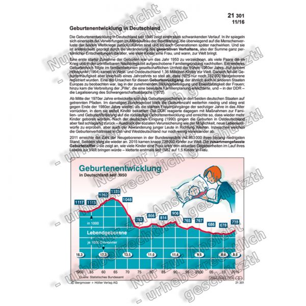 Ab Mitte der 1970er Jahre entwickelten sich die Geburten in den beiden deutschen Staaten auseinander. Im damaligen Bundesgebiet blieb die Geburtenzahl weiterhin niedrig und stieg erst gegen Ende der 1980er Jahre wieder, als die starken Frauenjahrgänge der sechziger Jahre das Alter erreichten, in dem sie selbst Kinder bekamen. Die DDR reagierte dagegen mit Maßnahmen zur Familien- und Geburtenförderung auf die rückläufige Geburtenzahl und erreichte so eine Trendumkehr. Nach der deutschen Einigung (1990) gingen die Geburten im Osten aber fast schlagartig zurück – Ausdruck der sozialen Verunsicherung wie der Möglichkeit, neue Lebensentwürfe zu erproben, aber auch Folge der Abwanderung junger Leute in Richtung Westen. Inzwischen unterscheiden sich die Geburtenverhältnisse in Ost und West kaum noch.