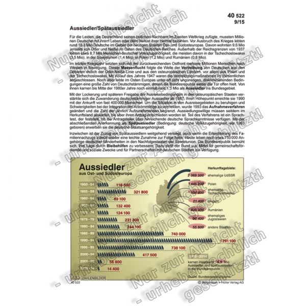 Im letzten Kriegsjahr setzten sich mit der zurückweichenden Ostfront mehrere Millionen Menschen nach Westen in Bewegung. Dieser Massenflucht folgte die Welle der Vertreibung von Deutschen aus den Gebieten östlich der Oder-Neiße-Linie und aus den osteuropäischen Ländern, vor allem aus Polen und der Tschechoslowakei. Mit Ablauf des Jahres 1947 waren die Vertreibungsmaßnahmen im Wesentlichen abgeschlossen. Noch aber lebte im Osten Europas unter oft sehr ungünstigen, diskriminierenden Bedingungen eine große Zahl von Deutschstämmigen, denen die Bundesrepublik weiter die Tür offen hielt. Von ihnen kamen bis Mitte der 1980er Jahre noch einmal rund 1,3 Mio als Aussiedler ins Bundesgebiet.