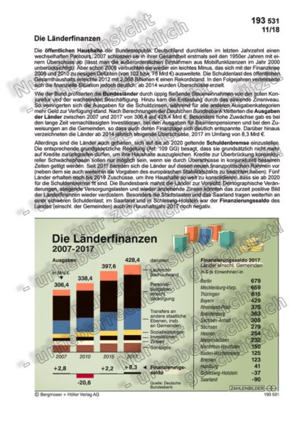 Wie der Bund profitierten die Bundesländer durch üppig fließende Steuereinnahmen von der guten Konjunktur und der wachsenden Beschäftigung. Hinzu kam die Entlastung durch das sinkende Zinsniveau. So verringerten sich die Ausgaben für die Schuldzinsen, während für alle anderen Ausgabenkategorien mehr Geld zur Verfügung stand. Nach Berechnungen der Deutschen Bundesbank kletterten die Ausgaben der Länder zwischen 2007 und 2017 von 306,4 auf 428,4 Mrd €. Besonders hohe Zuwächse gab es bei den lange Zeit vernachlässigten Investitionen, bei den Ausgaben für Beamtenpensionen und bei den Zuweisungen an die Gemeinden, so dass auch deren Finanzlage sich deutlich entspannte. Darüber hinaus verzeichneten die Länder ab 2014 jährlich steigende Überschüsse, 2017 im Umfang von 8,3 Mrd €.