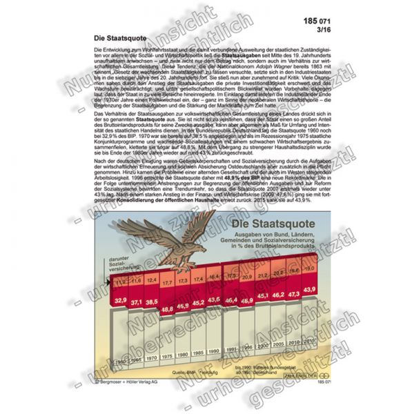 Die Staatsquote gibt an, wie hoch die Staatsausgaben im Verhältnis zur Wirtschaftsleistung eines Jahres sind. Im alten Bundesgebiet lag sie 1965 noch bei knapp 33% des BIP. In der Corona-Pandemie schoss sie auf über 50% nach oben, weil der Staat mit sozialpolitischen und wirtschaftlichen Stützungsmaßnahmen gefordert war. Die Entwicklung der Staatsquote über mehr als 5 Jahrzehnte!