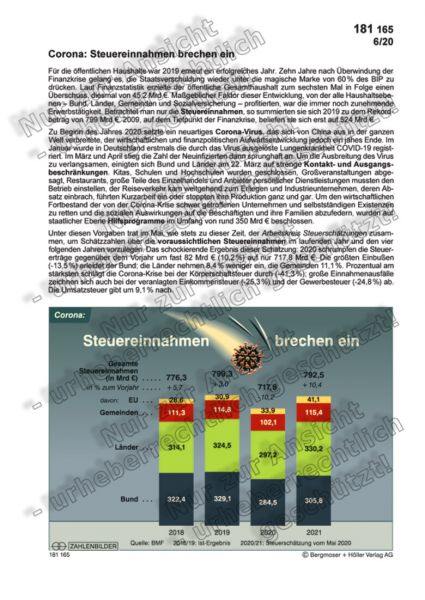 Unter diesen Vorgaben trat im Mai, wie stets zu dieser Zeit, der Arbeitskreis Steuerschätzungen zusammen, um Schätzzahlen über die voraussichtlichen Steuereinnahmen im laufenden Jahr und den vier folgenden Jahren vorzulegen. Das schockierende Ergebnis dieser Schätzung: 2020 schrumpfen die Steuererträge gegenüber dem Vorjahr um fast 82 Mrd € (10,2 %) auf nur 717,8 Mrd €. Die größten Einbußen (-13,5 %) erleidet der Bund; die Länder nehmen 8,4 % weniger ein, die Gemeinden 11,1 %. Prozentual am stärksten schlägt die Corona-Krise bei der Körperschaftsteuer durch (-41,3 %); große Einnahmenausfälle zeichnen sich auch bei der veranlagten Einkommensteuer (-25,3 %) und der Gewerbesteuer (-24,8 %) ab. Die Umsatzsteuer gibt um 9,1 % nach.