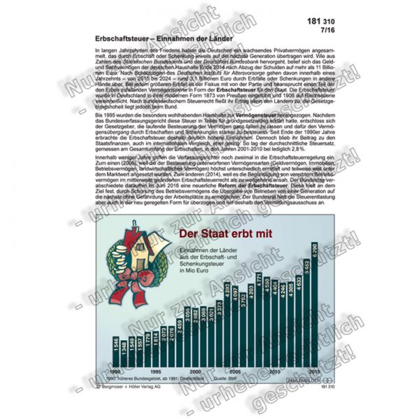 In langen Jahrzehnten des Friedens haben die Deutschen ein wachsendes Privatvermögen angesammelt, das durch Erbschaft oder Schenkung auf die nächsten Generationen übertragen wird. Wie aus Zahlen des Statistischen Bundesamts und der Deutschen Bundesbank hervorgeht, belief sich das Geld- und Sachvermögen der deutschen Haushalte Ende 2021 nach Abzug der Schulden auf rund 17,5 Billionen Euro. Davon gehen nach Schätzungen des Deutschen Instituts für Wirtschaftsforschung jährlich bis zu 400 Milliarden Euro durch Erbfälle oder Schenkungen in andere Hände über. Bei jedem größeren Erbfall ist der Fiskus mit von der Partie und beansprucht einen Teil der den Erben zufallenden Vermögenswerte in Form der Erbschaftsteuer für den Staat. Die Erbschaftsteuer in ihrer modernen Form wurde in Deutschland 1873 von Preußen eingeführt und 1906 auf Reichsebene vereinheitlicht. Nach bundesdeutschem Steuerrecht fließt ihr Ertrag allein den Ländern zu; die Gesetzgebungshoheit liegt jedoch beim Bund.