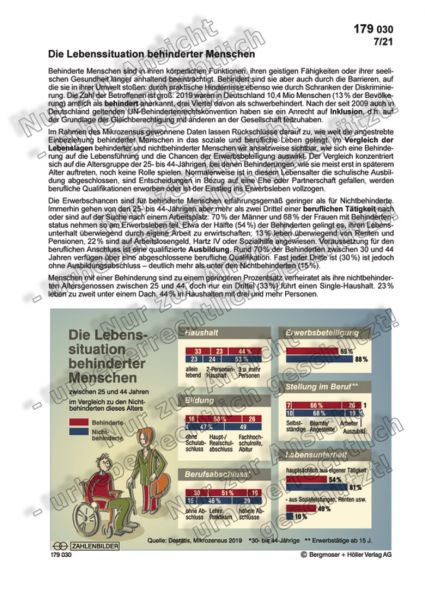 Die Erwerbschancen sind für behinderte Menschen erfahrungsgemäß geringer als für Nichtbehinderte. Immerhin gehen von den 25- bis 44-Jährigen aber mehr als zwei Drittel einer beruflichen Tätigkeit nach oder sind auf der Suche nach einem Arbeitsplatz: 70 % der Männer und 68 % der Frauen mit Behindertenstatus nehmen so am Erwerbsleben teil. Etwa der Hälfte (54 %) der Behinderten gelingt es, ihren Lebensunterhalt überwiegend durch eigene Arbeit zu erwirtschaften; 13 % leben überwiegend von Renten und Pensionen, 22 % sind auf Arbeitslosengeld, Hartz IV oder Sozialhilfe angewiesen. Voraussetzung für den beruflichen Anschluss ist eine qualifizierte Ausbildung. Rund 70 % der Behinderten zwischen 30 und 44 Jahren verfügen über eine abgeschlossene berufliche Qualifikation. Fast jeder Dritte ist (30 %) ist jedoch ohne Ausbildungsabschluss – deutlich mehr als unter den Nichtbehinderten (15 %).