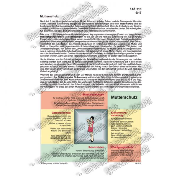 Nach Art. 6 des Grundgesetzes hat jede Mutter Anspruch auf den Schutz und die Fürsorge der Gemeinschaft. Konkrete Absicherung bringen die gesetzlichen Bestimmungen über den Mutterschutz und ...