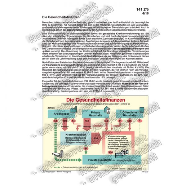 Eine Schlüsselstellung im Gesundheitssystem nimmt die gesetzliche Krankenversicherung ein. Sie dient der solidarischen Eigenvorsorge der Versicherten und wird durch die Versicherungsbeiträge der Arbeitnehmer und ihrer Arbeitgeber sowie durch staatliche Zuschüsse finanziert. Im Krankheitsfall haben die Versicherten (und ihre mitversicherten Angehörigen) Anspruch auf die notwendige ärztliche Behandlung, auf Krankenhauspflege und Rehabilitationsmaßnahmen und auf die Versorgung mit Medikamenten, Heil- und Hilfsmitteln. Von Zuzahlungen und Selbstbehalten abgesehen, werden die Versicherten im Großen und Ganzen unterschiedslos und unentgeltlich mit den erforderlichen Gesundheitsdienstleistungen und -gütern versorgt. Die Abrechnung der Kosten erfolgt auf der Grundlage vertraglicher Vereinbarungen direkt zwischen den Leistungserbringern und den Krankenkassen. Neben den genannten Sachleistungen erhalten die Versicherten im Krankheitsfall Geldzahlungen, die zur Sicherung des Einkommens dienen (so vor allem die Lohnfortzahlung durch den Arbeitgeber und das Krankengeld der Krankenkassen).