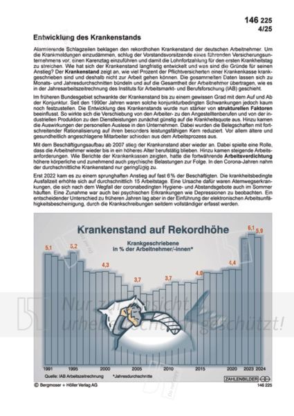 Mit dem Beschäftigungsaufbau ab 2007 stieg der Krankenstand aber wieder an. Dabei spielte eine Rolle, dass die Arbeitnehmer wieder bis in ein höheres Alter berufstätig blieben. Hinzu kamen steigende Arbeitsanforderungen. Wie Berichte der Krankenkassen zeigten, hatte die fortwährende Arbeitsverdichtung höhere körperliche und zunehmend auch psychische Belastungen zur Folge. In den Corona-Jahren nahm der durchschnittliche Krankenstand nur geringfügig zu.