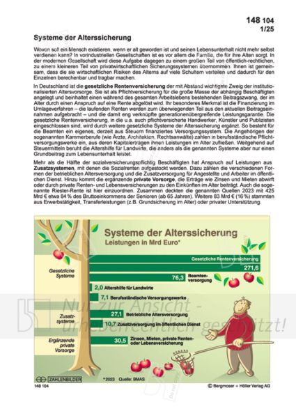 Wovon soll ein Mensch existieren, wenn er alt geworden ist und seinen Lebensunterhalt nicht mehr selbst verdienen kann? In vorindustriellen Gesellschaften ist es vor allem die Familie, die für ihre Alten sorgt. In der modernen Gesellschaft wird diese Aufgabe dagegen zu einem großen Teil von öffentlich-rechtlichen, zu einem kleineren Teil von privatwirtschaftlichen Sicherungssystemen übernommen. Ihnen ist gemeinsam, dass die sie wirtschaftlichen Risiken des Alterns auf viele Schultern verteilen und dadurch für den Einzelnen berechenbar und tragbar machen.