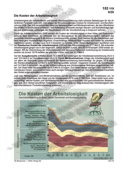 Durch die Arbeitsmarktreform 2005 wurden die Kosten der Arbeitslosigkeit in ihrer Höhe und Zusammensetzung stark beeinflusst. So verkürzte sich die Bezugsdauer für das Arbeitslosengeld I, während das pauschale Arbeitslosengeld II die frühere Arbeitslosenhilfe ablöste. Erwerbsfähige Hilfebedürftige mussten sich fortan als arbeitslos registrieren lassen, um das neue ALG II beziehen zu können. Unter diesen Bedingungen bezifferten sich die fiskalischen Kosten der Arbeitslosigkeit 2005 auf den Rekordbetrag von 87,7 Mrd €. Mit sinkender Arbeitslosigkeit gingen sie in den folgenden Jahren deutlich zurück. Allerdings beliefen sich die Kosten der Arbeitslosigkeit 2018 trotz der anhaltenden Entspannung am Arbeitsmarkt immer noch auf 50,3 Mrd €. In der Corona-Krise des Jahres 2020 erfolgte ein erneuter steiler Anstieg. Und die wirtschaftliche Stagnation, die sich daran anschloss, verhinderte auch eine Rückkehr zu deutlich niedrigeren Kosten.