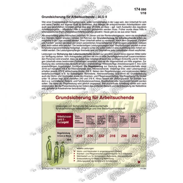 Leistungen zur Sicherung des Lebensunterhalts werden nur gewährt, soweit keine eigenen Mittel dafür vorhanden sind. Das heißt, die Antragsteller und die Personen ihrer Bedarfsgemeinschaft müssen außer ihrer Arbeitskraft auch ihre sonstigen Einkünfte und ihr Vermögen einsetzen, ehe sie die Allgemeinheit um Hilfe angehen. Angespartes Vermögen in Höhe des gesetzlichen Freibetrags bleibt ihnen aber erhalten. Zur Deckung des Lebensunterhalts erhalten die Angehörigen der Bedarfsgemeinschaft Bürgergeld, das nach pauschalen Regelsätzen – je nach der Stellung und dem Alter der Personen – gewährt wird. Zum 1.1.2024 steigen die Regelsätze um rund 12%. Alleinstehende und Alleinerziehende erhalten 563 € im Monat, die Partner einer Ehe oder Lebensgemeinschaft je 506 € und die minderjährigen Kinder zwischen 357 und 471 €. Neben den Regelleistungen und ergänzenden Mehrbedarfszuschlägen (z.B. für Schwangere, Behinderte, Alleinerziehende) übernimmt die Grundsicherung auch die Wohn- und Heizkosten sowie den Kranken- und Pflegekassenbeitrag für die erwerbsfähigen Leistungsbezieher. Die sogenannten Regelbedarfe werden alle fünf Jahre anhand der durchschnittlichen Ausgaben einkommensschwacher Haushalte neu berechnet und danach jährlich angepasst. Ihre Anhebung richtet sich zunächst nach der Preisentwicklung bei Gütern des einfachen Bedarfs und der Entwicklung der Nettolöhne und -gehälter je Beschäftigten; ergänzend dazu wird die jüngste Preisentwicklung berücksichtigt. Auf die kritische Frage, ob es sich angesichts der Höhe des Bürgergelds überhaupt noch lohne zu arbeiten, ergaben Modellrechnungen, dass Vollzeitbeschäftigte mit Mindestlohn immer noch einen klaren Einkommensvorsprung haben.