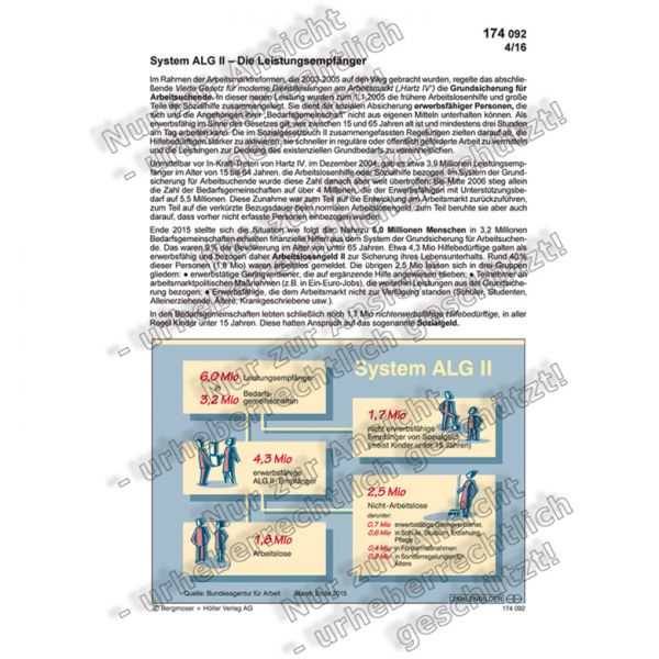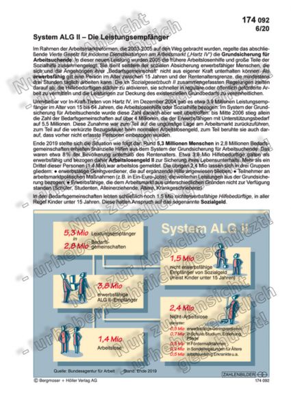 Ende 2024 stellte sich die Situation wie folgt dar: Rund 5,4 Millionen Menschen in 2,9 Millionen Bedarfsgemeinschaften erhielten finanzielle Hilfen aus dem System der Grundsicherung für Arbeitsuchende. Das waren etwa 7,5 Prozent der Bevölkerung unterhalb des Rentenalters. Etwa 4,0 Mio Hilfebedürftige (2,1 Mio Deutsche und 1,9 Mio Ausländer) galten als erwerbsfähig. Davon waren 1,8 Mio als arbeitslos gemeldet. Die übrigen 2,2 Mio lassen sich in drei Gruppen unterteilen: ● erwerbstätige Geringverdiener, die auf ergänzende Hilfe angewiesen blieben; ● Teilnehmer an arbeitsmarktpolitischen Maßnahmen (z.B. in sogenannten Ein-Euro-Jobs), die weiterhin Leistungen aus der Grundsicherung bezogen; ● Erwerbsfähige, die dem Arbeitsmarkt aus unterschiedlichen Gründen nicht zur Verfügung standen (Schüler, Studenten, Auszubildende, Alleinerziehende, Pflegepersonen, Krankgeschriebene, ältere Personen in Sonderregelungen).