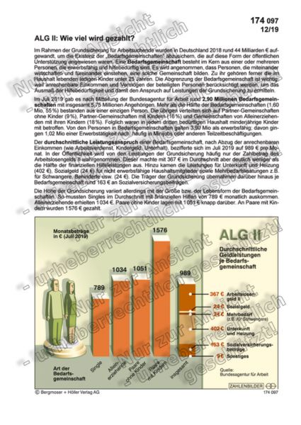 Der durchschnittliche Leistungsanspruch einer Bedarfsgemeinschaft, nach Abzug der anrechenbaren Einkommen (wie Arbeitsverdienst, Kindergeld, Unterhalt) bezifferte sich im Juli 2023 auf 1 226 € pro Monat. In der Öffentlichkeit wird von der Grundsicherung häufig nur der Zahlbetrag der Regelleistung wahrgenommen. Diese machte mit durchschnittlich 479 € für die Erwerbsfähigen aber deutlich weniger als die Hälfte der finanziellen Hilfen aus. Hinzu kamen die Übernahme der Wohnkosten (482 €), der Regelbedarf der nicht erwerbsfähigen Haushaltsmitglieder (37 €) sowie der Mehrbedarf z.B. für Schwangere, Behinderte usw. (29 €). Zusammen bilden diese Leistungen das sogenannte Bürgergeld. Die Träger der Grundsicherung übernahmen darüber hinaus Sozialversicherungsleistungen von 191 € je Bedarfsgemeinschaft.