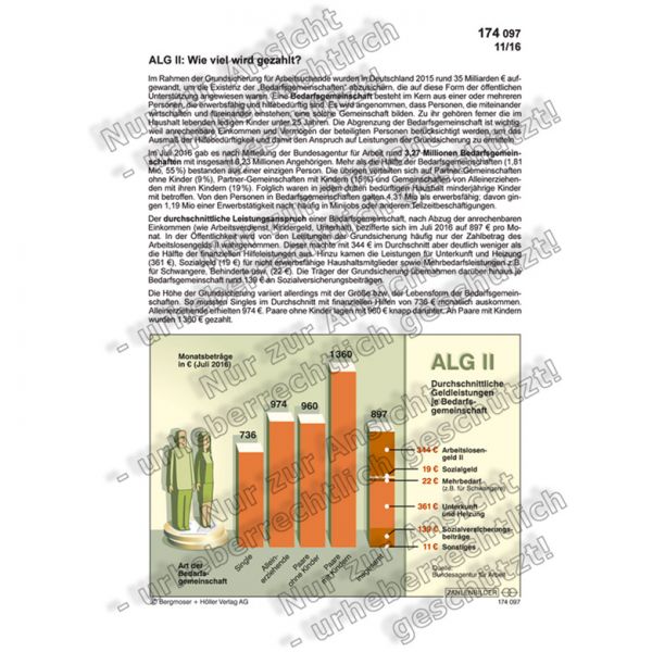 Der durchschnittliche Leistungsanspruch einer Bedarfsgemeinschaft, nach Abzug der anrechenbaren Einkommen (wie Arbeitsverdienst, Kindergeld, Unterhalt) bezifferte sich im Juli 2023 auf 1 226 € pro Monat. In der Öffentlichkeit wird von der Grundsicherung häufig nur der Zahlbetrag der Regelleistung wahrgenommen. Diese machte mit durchschnittlich 479 € für die Erwerbsfähigen aber deutlich weniger als die Hälfte der finanziellen Hilfen aus. Hinzu kamen die Übernahme der Wohnkosten (482 €), der Regelbedarf der nicht erwerbsfähigen Haushaltsmitglieder (37 €) sowie der Mehrbedarf z.B. für Schwangere, Behinderte usw. (29 €). Zusammen bilden diese Leistungen das sogenannte Bürgergeld. Die Träger der Grundsicherung übernahmen darüber hinaus Sozialversicherungsleistungen von 191 € je Bedarfsgemeinschaft.