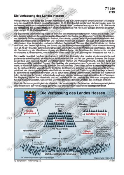 Wenige Monate nach Ende des Zweiten Weltkriegs wurde auf Anordnung der amerikanischen Militärregierung das Land Groß-Hessen geschaffen und am 16.10.1945 feierlich proklamiert. Ein Jahr später legte die verfassungberatende Landesversammlung den Entwurf einer Landesverfassung vor. Am 1.12.1946 wurde die Verfassung des Landes Hessen in einem Volksentscheid mit 76,8 % der gültigen Stimmen angenommen und am 18.12.1946 verkündet.