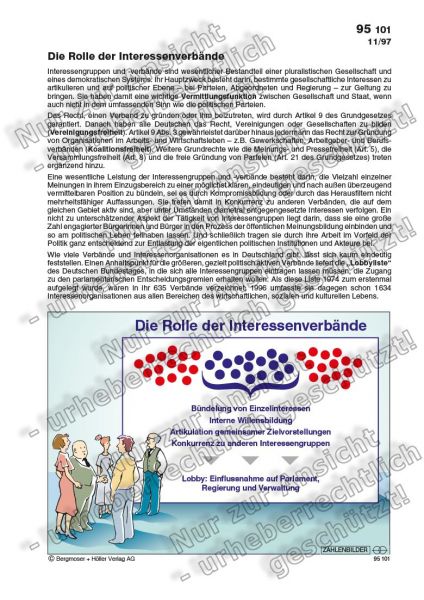 Eine wesentliche Leistung der Interessengruppen und -verbände besteht darin, die Vielzahl einzelner Meinungen in ihrem Einzugsbereich zu einer möglichst klaren, eindeutigen und nach außen überzeugend vermittelbaren Position zu bündeln, sei es durch Kompromissbildung oder durch das Herausfiltern nicht mehrheitsfähiger Auffassungen. Sie treten damit in Konkurrenz zu anderen Verbänden, die auf dem gleichen Gebiet aktiv sind, aber unter Umständen diametral entgegengesetzte Interessen verfolgen. Ein nicht zu unterschätzender Aspekt der Tätigkeit von Interessengruppen liegt darin, dass sie eine große Zahl engagierter Bürgerinnen und Bürger in den Prozess der öffentlichen Meinungsbildung einbinden und so am politischen Leben teilhaben lassen. Und schließlich tragen sie durch ihre Arbeit im Vorfeld der Politik ganz entscheidend zur Entlastung der eigentlichen politischen Institutionen und Akteure bei.