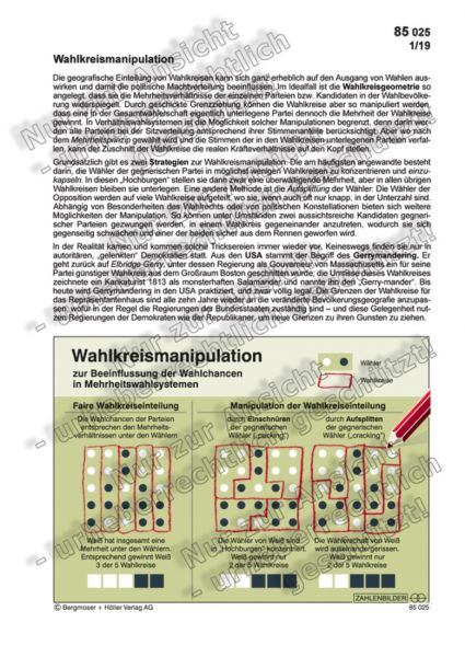 Die geografische Einteilung von Wahlkreisen kann sich ganz erheblich auf den Ausgang von Wahlen auswirken und damit die politische Machtverteilung beeinflussen. Durch geschickte Grenzziehung können die Wahlkreise aber so manipuliert werden, dass eine in der Gesamtwählerschaft eigentlich unterlegene Partei dennoch die Mehrheit der Wahlkreise gewinnt.