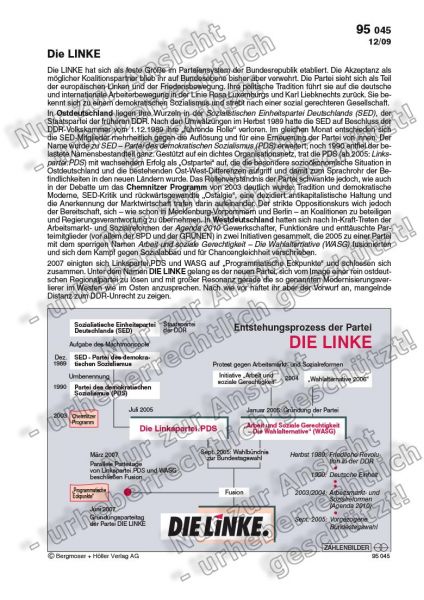 In Ostdeutschland liegen ihre Wurzeln in der Sozialistischen Einheitspartei Deutschlands (SED), der Staatspartei der früheren DDR. Nach den Umwälzungen im Herbst 1989 hatte die SED auf Beschluss der DDR-Volkskammer vom 1.12.1989 ihre "führende Rolle" verloren. Im gleichen Monat entschieden sich die SED-Mitglieder mehrheitlich gegen die Auflösung und für eine Erneuerung der Partei von innen. Der Name wurde zu SED - Partei des demokratischen Sozialismus (PDS) erweitert; noch 1990 entfiel der belastete Namensbestandteil ganz. Gestützt auf ein dichtes Organisationsnetz, trat die PDS (ab 2005: Linkspartei.PDS) mit wachsendem Erfolg als "Ostpartei" auf, die die besondere sozioökonomische Situation in Ostdeutschland und die bestehenden Ost-West-Differenzen aufgriff und damit zum Sprachrohr der Befindlichkeiten in den neuen Ländern wurde. Das Rollenverständnis der Partei schwankte jedoch, wie auch in der Debatte um das Chemnitzer Programm von 2003 deutlich wurde: Tradition und demokratische Moderne, SED-Kritik und rückwärtsgewandte "Ostalgie", eine dezidiert antikapitalistische Haltung und die Anerkennung der Marktwirtschaft trafen darin aufeinander. Der strikte Oppositionskurs wich jedoch der Bereitschaft, sich - wie schon in Mecklenburg-Vorpommern und Berlin - an Koalitionen zu beteiligen und Regierungsverantwortung zu übernehmen. In Westdeutschland hatten sich nach In-Kraft-Treten der Arbeitsmarkt- und Sozialreformen der Agenda 2010 Gewerkschafter, Funktionäre und enttäuschte Parteimitglieder (vor allem der SPD und der GRÜNEN) in zwei Initiativen gesammelt, die 2005 zu einer Partei mit dem sperrigen Namen Arbeit und soziale Gerechtigkeit - Die Wahlalternative (WASG) fusionierten und sich dem Kampf gegen Sozialabbau und für Chancengleichheit verschrieben.