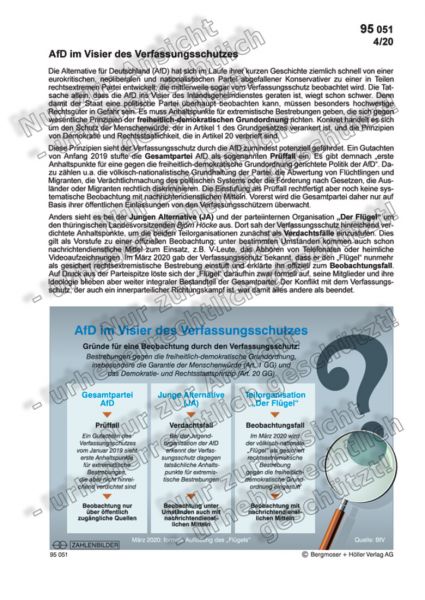 Diese Prinzipien sieht das Bundesamt für Verfassungsschutz durch die AfD zumindest potenziell gefährdet. Anfang 2019 stufte es die Gesamtpartei AfD als sogenannten Prüffall ein. Die darauf folgende Auswertung öffentlicher Verlautbarungen der Partei und einer Reihe von Funktionsträgern ergab „tatsächliche Anhaltspunkte“ für den Verdacht, die Partei verfolge extremistische Bestrebungen. Der Verfassungsschutz sah solche Anhaltspunkte in einer völkisch-nationalistischen Grundhaltung der Partei, verbunden mit politischen Forderungen, die auf die rechtliche Diskriminierung von Ausländern oder Migranten hinauslaufen, in fremden-, minderheiten- und islamfeindlichen Positionen und in der Verächtlichmachung des politischen Systems der Bundesrepublik. Im März 2021 wurde die AfD deshalb zum Verdachtsfall hochgestuft, der vom Verfassungsschutz genauer unter die Lupe genommen werden darf. Die AfD ging gegen diese Einstufung gerichtlich vor, wurde aber vom Oberverwaltungsgericht Münster am 13.5.2024 in zweiter Instanz abgewiesen.