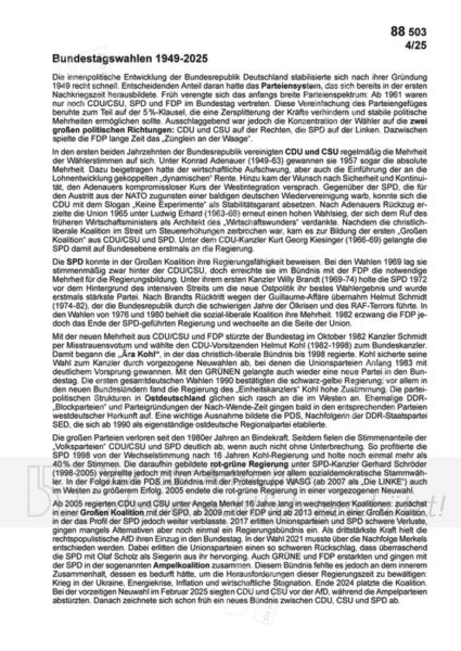 Ab 2005 regierten CDU und CSU unter Angela Merkel 16 Jahre lang in wechselnden Koalitionen: zunächst in einer Großen Koalition mit der SPD, ab 2009 mit der FDP. Der FDP brachte ihre unglückliche Regierungsbeteiligung 2013 aber so dramatische Verluste, dass sie erstmals an der 5 %-Hürde scheiterte. So kam es erneut zu einer Großen Koalition. 2017 fiel die SPD auf ihr bis dahin schlechtestes Ergebnis im Bund. Auch CDU und CSU erlitten schwere Verluste. Als drittstärkste Kraft zog die rechtspopulistische AfD in den Bundestag ein. Da sich die FDP einer „Jamaika“-Koalition (mit CDU/CSU und GRÜNEN) verweigerte, ging die SPD noch einmal ein Regierungsbündnis mit der Union ein. In der Wahl 2021 erlitten die Unionsparteien einen so schweren Rückschlag, dass überraschend die SPD mit ihrem Kandidaten Olaf Scholz als stärkste Kraft aus ihr hervorging. Auch GRÜNE und FDP erstarkten, so dass eine „Ampelkoalition“ in greifbare Nähe rückte.