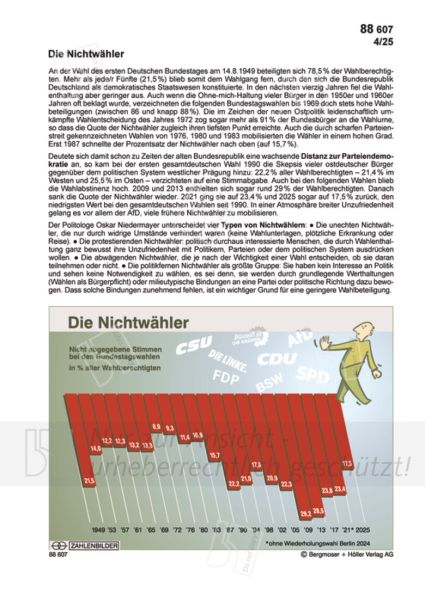 Deutete sich damit schon zu Zeiten der alten Bundesrepublik eine wachsende Distanz zur Parteiendemokratie an, so kam bei der ersten gesamtdeutschen Wahl 1990 die Skepsis vieler ostdeutscher Bürger gegenüber dem politischen System westlicher Prägung hinzu: 22,2 % aller Wahlberechtigten – 21,4 % im Westen und 25,5 % im Osten – verzichteten auf eine Stimmabgabe. Auch bei den folgenden Wahlen blieb die Wahlabstinenz hoch. 2009 und 2013 enthielten sich sogar rund 29 % der Wahlberechtigten. Danach sank die Quote der Nichtwähler wieder. 2021 ging sie auf 23,4 % und 2025 sogar auf 17,5 % zurück, den niedrigsten Wert bei den gesamtdeutschen Wahlen seit 1990. In einer Atmosphäre breiter Unzufriedenheit gelang es vor allem der AfD, viele frühere Nichtwähler zu mobilisieren.