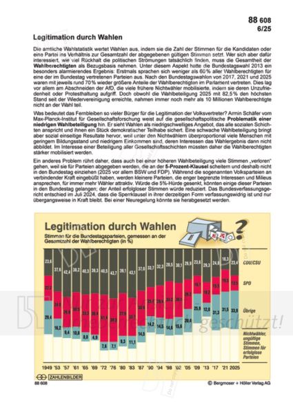 Ein anderes Problem rührt daher, dass auch bei einer höheren Wahlbeteiligung viele Stimmen „verloren“ gehen, weil sie für Parteien abgegeben werden, die an der 5-Prozent-Klausel scheitern und deshalb nicht in den Bundestag einziehen (2025 vor allem BSW und FDP). Während die sogenannten Volksparteien an verbindender Kraft eingebüßt haben, werden kleinere Parteien, die enger begrenzte Interessen und Milieus ansprechen, für immer mehr Wähler attraktiv. Würde die 5%-Hürde gesenkt, könnten einige dieser Parteien in den Bundestag gelangen; der Anteil erfolgloser Stimmen würde reduziert. Das Bundesverfassungsgericht entschied im Juli 2024, dass die Sperrklausel in ihrer derzeitigen Form verfassungswidrig ist und nur übergangsweise in Kraft bleibt. Bei einer Neuregelung könnte sie herabgesetzt werden.