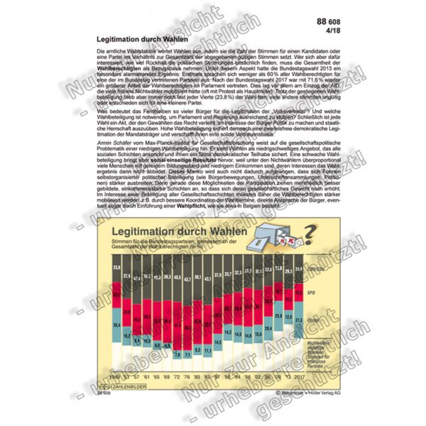 Das ZAHLENBILD behandelt das Thema der Wahlbeteiligung und der "verlorenen Stimme" bei einer Bundestagswahl. Was bedeutet es, wenn ein recht großer Teil der Wahlberechtigten gar keinen Einfluss auf die Zusammensetzung des Parlaments hat? Könnte die Senkung der 5%-Schwelle etwas daran ändern?