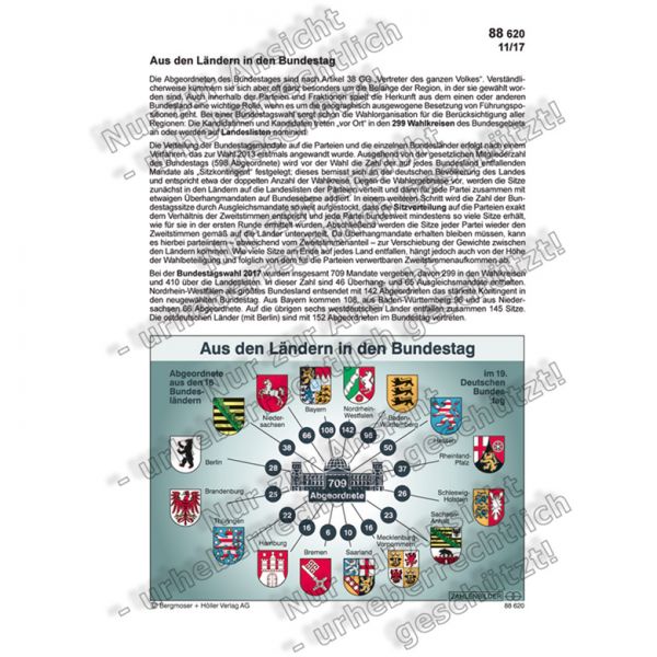 Im Bundestag sind die einzelnen Bundesländer annähernd proportional zur Zahl der Wahlberechtigten mit Abgeordneten vertreten. Leichte Abweichungen davon können entstehen, auf Grund der Wahlbeteiligung und der Stimmabgabe für letztlich erfolglose Parteien. Wie viele Abgeordnete aus Ihrem Land sitzen im Bundestag? Die Zahlen finden Sie hier!