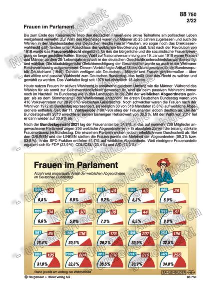 Das ZAHLENBILD geht auf die Geschichte des Frauenwahlrechts in Deutschland ein und zeigt, wie sich der Frauenanteil im Bundestag seit 1949 entwickelt hat. Am Beispiel der Wahl 2025 macht es deutlich, wie die Vertretung der Frauen im Bundestag von der Anwendung oder Ablehnung einer Frauenquote durch die Parteien abhängt.