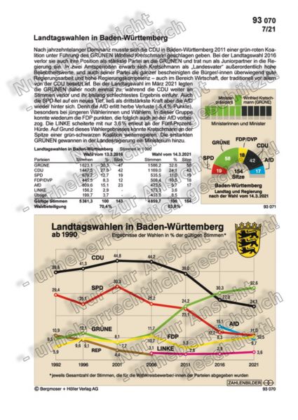 Nach jahrzehntelanger Dominanz musste sich die CDU in Baden-Württemberg 2011 einer grün-roten Koalition unter Führung des GRÜNEN Winfried Kretschmann geschlagen geben. Bei der Landtagswahl 2016 verlor sie auch ihre Position als stärkste Partei an die GRÜNEN und trat nun als Juniorpartner in die Regierung ein. In zwei Amtsperioden erwarb sich Kretschmann als „Landesvater“ außerordentlich hohe Beliebtheitswerte, und auch seiner Partei als ganzer bescheinigten die Bürger/-innen überwiegend gute Regierungsarbeit und hohe Regierungskompetenz – auch im Bereich Wirtschaft, der traditionell vor allem von der CDU besetzt ist. Bei der Landtagswahl im März 2021 legten die GRÜNEN daher noch einmal zu, während die CDU weiter an Stimmen verlor und ihr bislang schlechtestes Ergebnis einfuhr. Auch die SPD fiel auf ein neues Tief, ließ als drittstärkste Kraft aber die AfD wieder hinter sich. Denn die AfD erlitt herbe Verluste (-5,4 %-Punkte), besonders bei jüngeren Wählerinnen und Wählern. In dieser Gruppe konnte wiederum die FDP punkten, die folglich auch an der AfD vorbeizog. Die LINKE scheiterte mit nur 3,6% erneut an der Fünf-Prozent-Hürde. Auf Grund dieses Wahlergebnisses konnte Kretschmann an der Spitze einer grün-schwarzen Koalition weiterregieren. Die erstarkten GRÜNEN gewannen in der Landesregierung ein Ministerium hinzu.