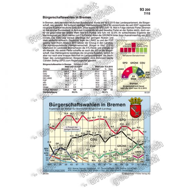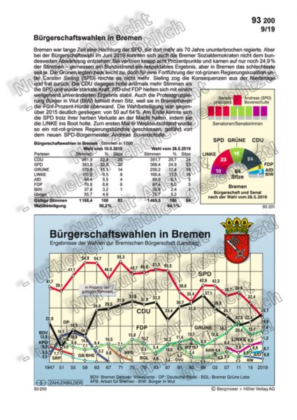 Bei den Bürgerschaftswahlen in Bremen fand die SPD wieder zu ihrer traditionellen Rolle als stärkste Partei zurück. Die rot-grün-rote Koalition konnte fortgesetzt werden. Am rechten Rand schnitt die Protestpartei "Bürger in Wut" ungewöhnlich erfolgreich ab. Sehen Sie im ZAHLENBILD die Entwicklung der Wahlergebnisse im kleinsten deutschen Bundesland seit 1991!