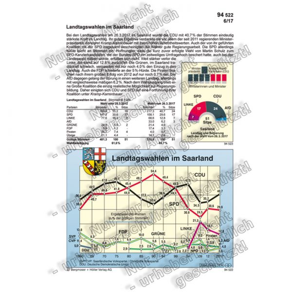 Vor dem Hintergrund des Kriegs in der Ukraine blieben bei der Landtagswahl im Saarland am 27.3.2022 die landespolitischen Interessen und Probleme ausschlaggebend. Das Votum der Wähler über die Leistungen der bisherigen CDU/SPD-Koalition fiel dabei überraschend deutlich aus. Während die CDU unter dem noch amtierenden Ministerpräsidenten Tobias Hans eine schwere Schlappe erlitt und nur noch auf 28,5 % der Stimmen kam, wurde die SPD mit 43,5 % erstmals seit 1999 wieder stärkste Partei. Ihre Spitzenkandidatin, Anke Rehlinger, hatte sich zuvor als Ministerin für Wirtschaft und Arbeit einen guten Ruf erworben. Die SPD profitierte aber auch vom dramatischen Niedergang der LINKEN, von der sich ihr langjähriger Spitzenmann, Oskar Lafontaine, kurz vor der Wahl losgesagt hatte. GRÜNE und FDP scheiterten knapp an der 5%-Hürde; den GRÜNEN fehlten dabei nur 23 Stimmen zum Einzug ins Landesparlament. So schaffte neben SPD und CDU allein die AfD (mit 5,7 %) trotz Stimmenverlusten den Sprung in den Landtag. Da die SPD mit 29 der 51 Mandate die absolute Mehrheit eroberte, brauchte sie nicht nach Koalitionspartnern Ausschau zu halten; sie stellte nach der Wahl die einzige Alleinregierung auf Länderebene.