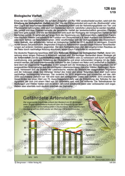 Die deutsche Regierung beschloss 2007 eine Nationale Strategie zur biologischen Vielfalt, deren Umsetzung einen langen Zeitraum in Anspruch nehmen wird. Ein wichtiger Bestandteil dieser Strategie gilt der Artenvielfalt und der Landschaftsqualität. Sie zu erhalten oder zu verbessern soll durch nachhaltige Landnutzung, eine geringere Belastung der Ökosysteme und einen schonenden Umgang mit der Natur erreicht werden. Als zusammenfassender Indikator für den Zustand von Natur und Landschaft in Deutschland dient der sogenannte Vogelindex: In ihm spiegelt sich die Veränderung der Bestandsgrößen von 51 ausgewählten Brutvogelarten aus den wichtigsten Lebensraumtypen (darunter Wälder, Siedlungen, Agrarland). Verbessert sich die Qualität der Lebensräume, wächst der Bestand der ausgewählten Vogelarten und der Indexwert steigt. Der bisherige Verlauf des Index und seiner Teilgrößen lässt aber noch keine nachhaltige Verbesserung erkennen. Der zunächst für 2015 angestrebte und inzwischen auf das Jahr 2030 verschobene Zielwert von 100 wird nach den vorliegenden Daten weit verfehlt: 2015 erreichte der Gesamtindex nur einen Wert von 70. Ausschlaggebend dafür war die Entwicklung des Teilindex für das Agrarland, der sich (mit einem Wert von 59) besonders weit vom Ziel entfernte. Die Teilindikatoren für Siedlungen und Wälder hielten sich im letzten Jahrzehnt annähernd stabil oder verbesserten sich sogar, blieben aber ebenfalls noch deutlich unterhalb der Zielmarke.