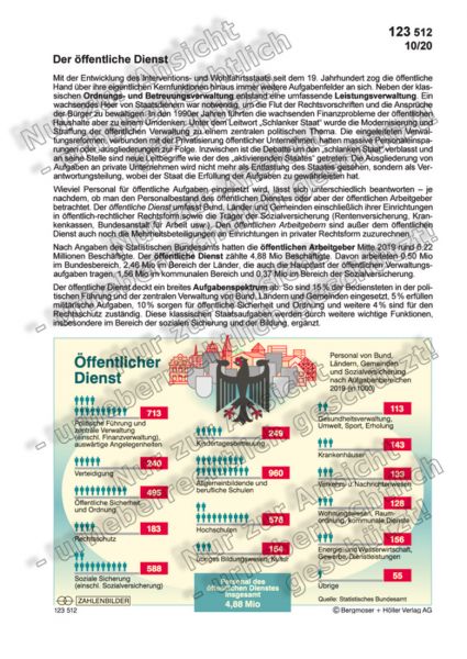 Zwischen hohen Erwartungen an staatliche Leistungen und Kritik am bürokratischen Wasserkopf schwankt das Bild des öffentlichen Dienstes. In diesem ZAHLENBILD geht es um sachliche Information: Wie groß ist der öffentliche Dienst überhaupt und wie verteilt sich sein Personal auf die vielfältigen Aufgabenbereiche?