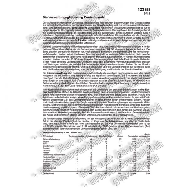 Die Länderverwaltung führt darüber hinaus selbstständig die jeweiligen Landesgesetze aus; das betrifft Aufgaben wie die Landes- und Raumplanung, die regionale Strukturpolitik, die Schulpolitik, die Polizei, den Sport oder die Kulturförderung. Die kommunalen Verwaltungsorgane sind in die staatlichen Verwaltungsaufgaben einbezogen. Die Gemeinden besitzen zugleich aber die Zuständigkeit, im Rahmen ihrer Selbstverwaltung alle Aufgaben der örtlichen Gemeinschaft in eigener Verantwortung zu regeln, soweit sie nicht dem Bund oder dem Land vorbehalten sind (Art. 28 GG).