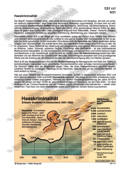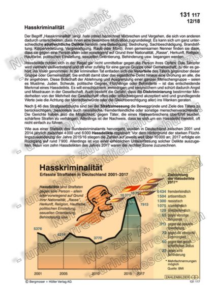 Wie aus einer Statistik des Bundeskriminalamts hervorgeht, wurden in Deutschland zwischen 2001 und 2014 jährlich zwischen 4 000 und 6 000 Hassdelikte registriert. Allerdings ist von einer erheblichen Untererfassung solcher Delikte auszugehen. Während der starken Flüchtlingszuwanderung der Jahre 2015/16 stiegen die Zahlen auf über 10 000 an; anschließend erfolgte ein Rückgang, bis die Fälle 2020 – vor dem Hintergrund der Corona-Pandemie und der Proteste gegen Infektionsschutzmaßnahmen – wieder stark zunahmen. Fast neun von zehn Hassdelikten waren auch 2020 der rechten Szene zuzurechnen.