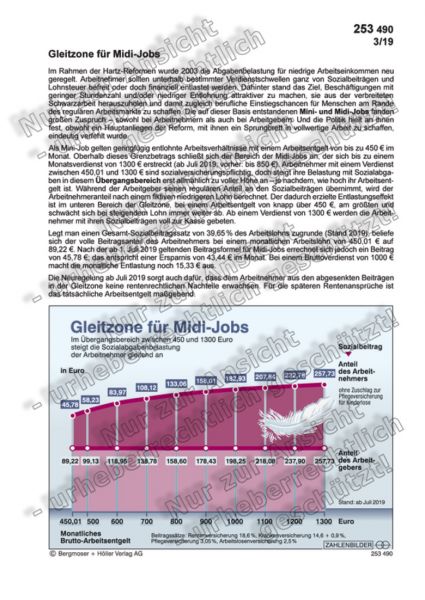 Die Arbeitgeber tragen am Beginn der Midi-Job-Gleitzone dagegen einen überproportional hohen Anteil an Sozialbeiträgen. Dieser entspricht mit rund 28 % des gezahlten Lohns etwa dem Pauschalsatz, der bei einem Mini-Job aufgebracht werden muss. Die prozentuale Belastung des Arbeitgebers sinkt mit zunehmender Höhe des Lohnbetrags und erreicht bei einem Monatsverdienst von 2 000 € ihre reguläre Höhe, d.h. Arbeitnehmer und Arbeitgeber bringen ab dieser Schwelle jeweils die Hälfte der Sozialbeiträge auf.
