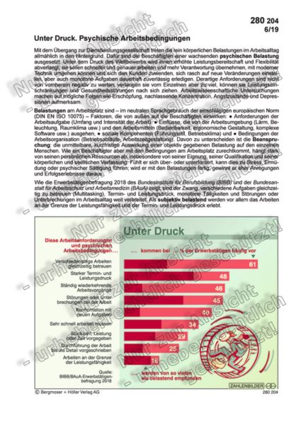 Mit dem Übergang zur Dienstleistungsgesellschaft treten die rein körperlichen Belastungen im Arbeitsalltag allmählich in den Hintergrund. Dafür sind die Beschäftigten einer wachsenden psychischen Belastung ausgesetzt: Unter dem Druck des Wettbewerbs wird ihnen erhöhte Leistungsbereitschaft und Flexibilität abverlangt; sie sollen schneller und genauer arbeiten und mehr Verantwortung übernehmen, mit moderner Technik umgehen können und sich den Kunden zuwenden, sich rasch auf neue Veränderungen einstellen, aber auch monotone Aufgaben dauerhaft zuverlässig erledigen. Derartige Anforderungen sind nicht von vornherein negativ zu werten; verlangen sie vom Einzelnen aber zu viel, können sie Leistungseinschränkungen und Gesundheitsstörungen nach sich ziehen. Arbeitswissenschaftliche Untersuchungen machen auf mögliche Folgen wie Erschöpfung, nachlassende Konzentration, Angstzustände und Depressionen aufmerksam.