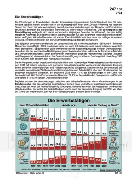 Das zeigt sich besonders am Beispiel der Landwirtschaft, die in Westdeutschland 1950 rund 5,1 Millionen Menschen beschäftigte, 2023 bundesweit aber nur noch 0,5 Millionen (und dabei trotzdem wesentlich mehr produzierte). Spiegelbildlich dazu entwickelte sich die Beschäftigungslage in vielen Dienstleistungsbereichen, die der wachsenden Nachfrage nur gerecht werden konnten, indem sie ihr Personal aufstockten (z.B. im Gesundheitswesen). Einen gebrochenen Trendverlauf zeigt das Produzierende Gewerbe (Industrie und Baugewerbe), dessen Anteil an der Gesamtbeschäftigung im früheren Bundesgebiet bis Anfang 1970 noch zunahm, sich seitdem aber rückläufig entwickelte.