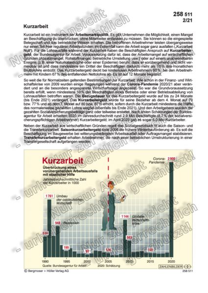 Kurzarbeit ist ein Instrument der Arbeitsmarktpolitik. Es gibt Unternehmen die Möglichkeit, einen Mangel an Beschäftigung zu überbrücken, ohne Mitarbeiter entlassen zu müssen. Sie können so die eingespielte Belegschaft und das betriebliche Wissen erhalten. Die betroffenen Arbeitnehmer leisten übergangsweise nur einen Teil ihrer regulären Arbeitsstunden; im Extremfall kann die Arbeit sogar ganz ausfallen („Kurzarbeit Null“). Für die Lohnausfälle während der Kurzarbeit haben die Beschäftigten Anspruch auf Kurzarbeitergeld. Voraussetzung dafür ist, dass der Arbeitsmangel auf wirtschaftlichen Gründen (Absatzmangel, Rohstoffmangel, betriebliche Umstellung usw.) oder auf einem unabwendbaren Ereignis (z. B. einer Naturkatastrophe oder einer Epidemie) beruht, dass er vorübergehend und nicht vermeidbar ist und dass mindestens ein Drittel der Beschäftigten dadurch mehr als 10 % des monatlichen Bruttolohns einbüßt. Das Kurzarbeitergeld deckt bei kinderlosen Arbeitnehmern 60 %, bei Arbeitnehmern mit Kindern 67 % des entfallenden Nettolohns ab. Es ist auf 12 Monate begrenzt.